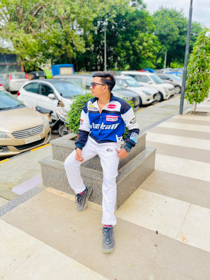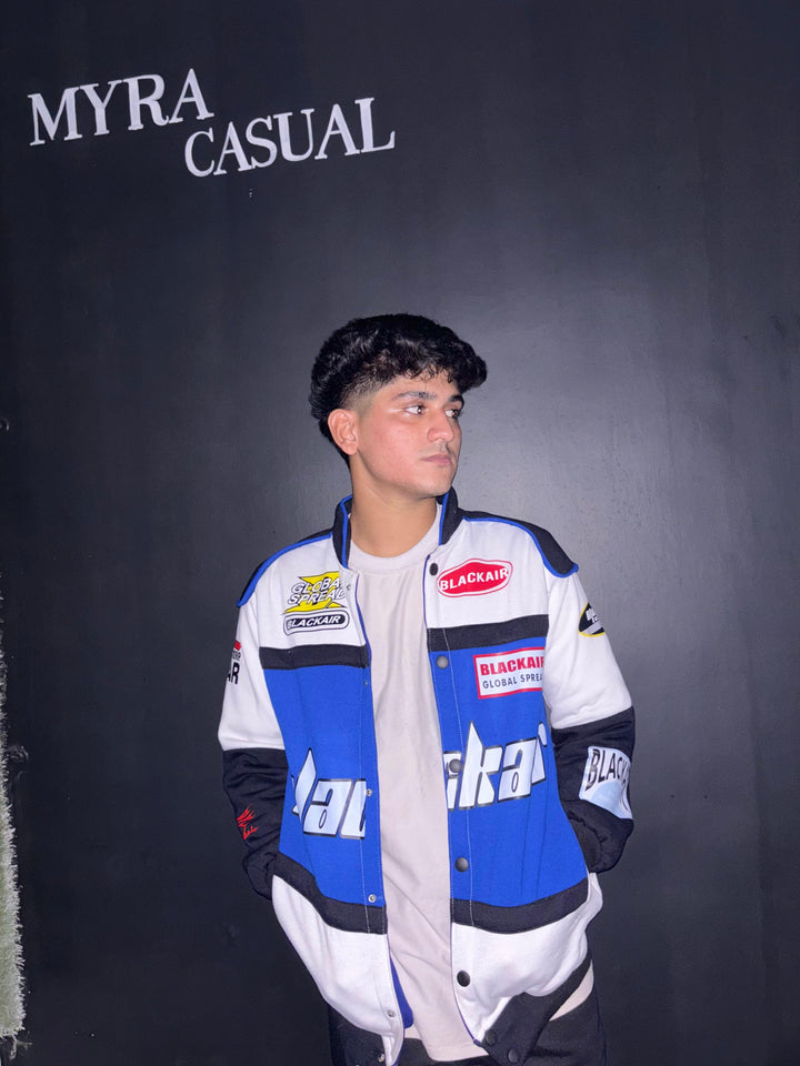 Turn heads everywhere with the exclusive BLACKAIR™ Street Racing Jacket – ModernDrip Edition. This bold blue, white & black color-blocked bomber screams speed and swagger, featuring premium embroidered patches like Blackair Global Spark, high-octane sponsor logos, and snap-button front closure. Crafted from heavy-duty, wind-resistant fabric with ribbed cuffs and collar for that perfect racer fit. Ideal for bike rides, car meets, photoshoots, or just flexing on the streets of Mumbai. A limited-drop piece made for those who live life in the fast lane. Grab yours before it’s gone – only at Myra Casual!