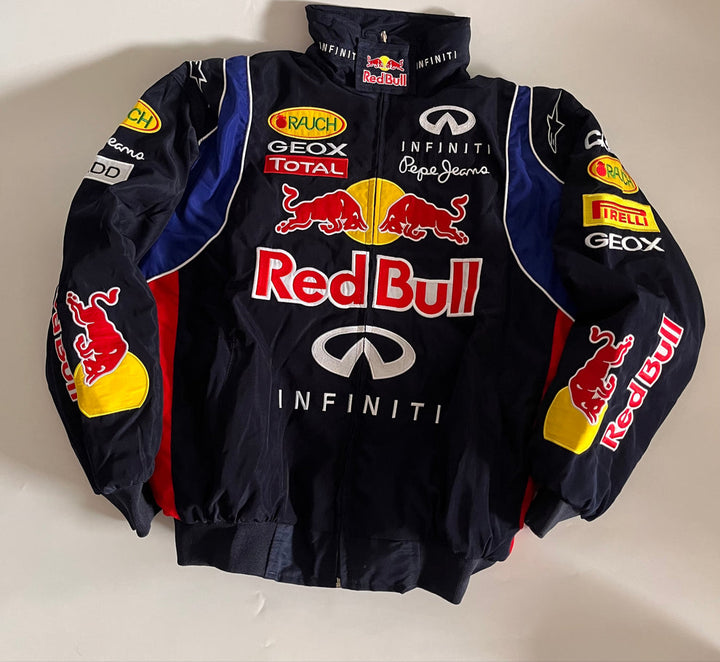 Gear up with this authentic Red Bull official racing jacket in striking navy blue. Featuring the bold Red Bull logo, "Gives You Wings" slogan, and sponsor badges like Pirelli, Casio, and Rauch, this jacket is a must-have for motorsport enthusiasts. Crafted for durability and style, it’s perfect for casual wear or as a collector’s item. Boost your wardrobe with this high-energy piece today!